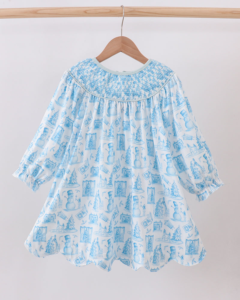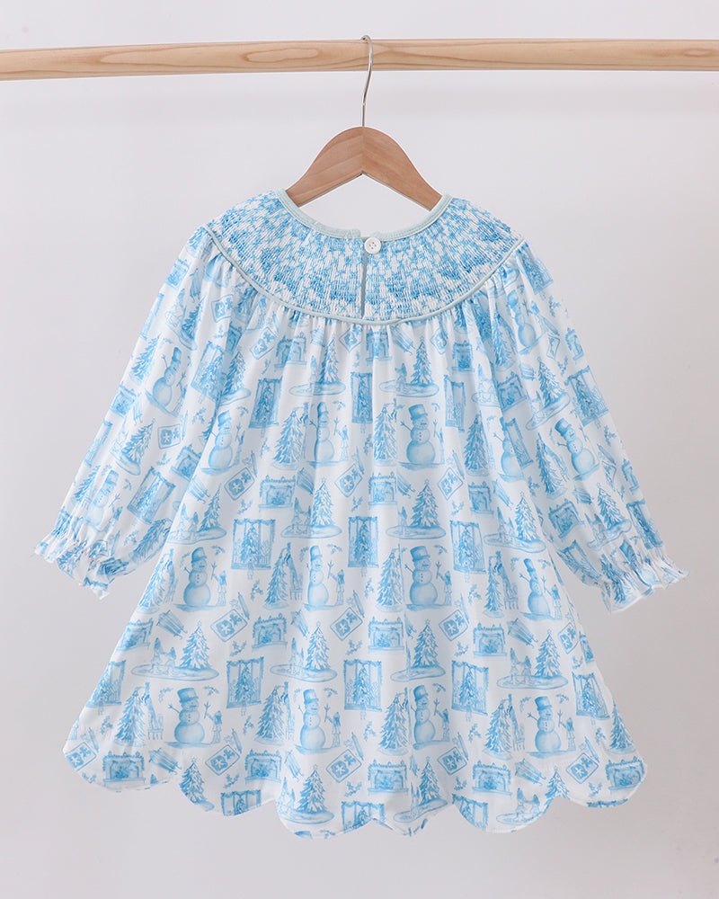 Let your little one twirl into the magic of winter in our Frosty Wonderland Blue Smocked Dress! ❄️💙 This timeless piece features a soft blue toile print adorned with charming snowmen, Christmas trees, and festive scenes — perfect for capturing the spirit of the season. The delicate smocking across the neckline adds a classic touch, while the scalloped hem and puffed sleeves complete the look with sweet holiday elegance.