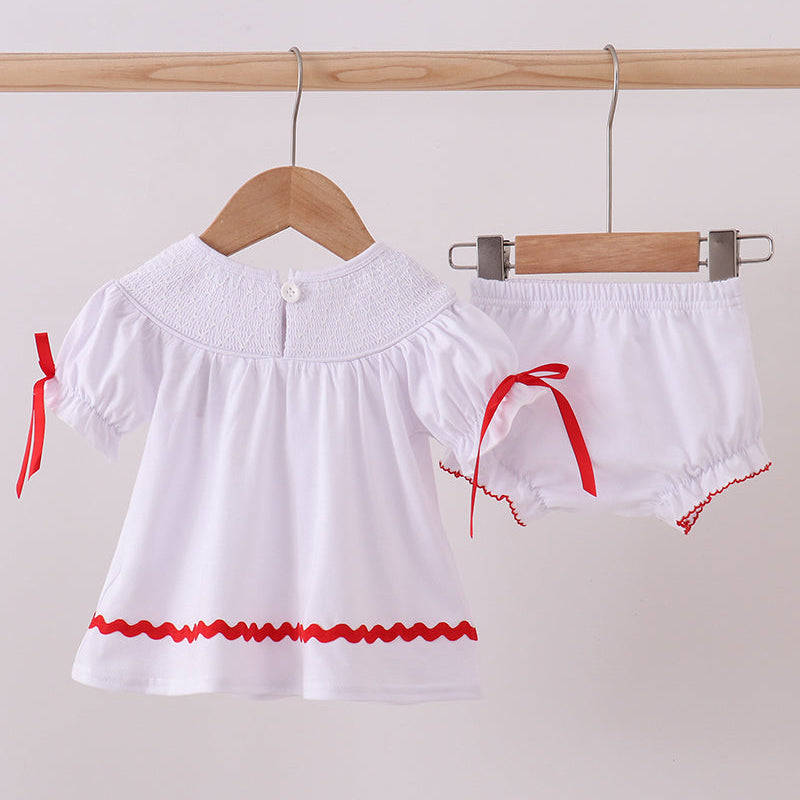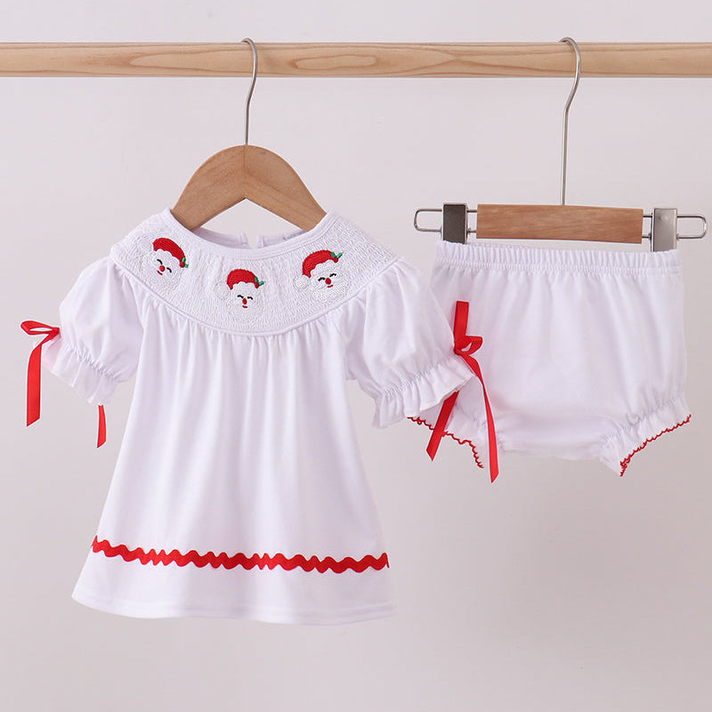 Dress your little one in timeless holiday charm with the White Christmas Santa Smocked Baby Bloomer Set. This classic two-piece outfit features a white smocked top with hand-stitched Santa faces, puff sleeves with red ribbon bows, and a matching bloomer trimmed in red for the perfect festive touch. Made from soft, breathable cotton, it’s gentle on baby’s skin and ideal for celebrating Christmas in cozy style.
