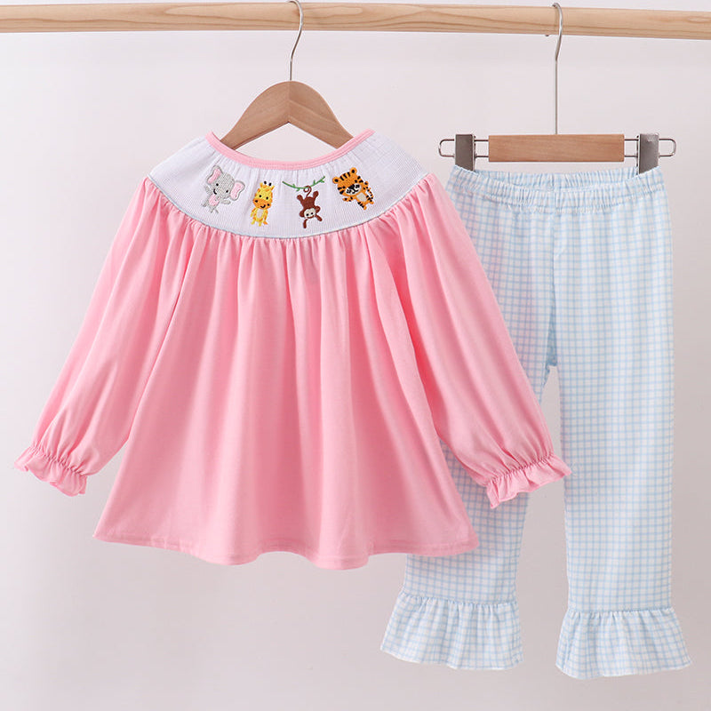 This sweet two-piece set features a pink smocked top beautifully embroidered with adorable zoo animals (elephant, giraffe, monkey, and tiger) paired with light blue gingham ruffle pants for a picture-perfect look.