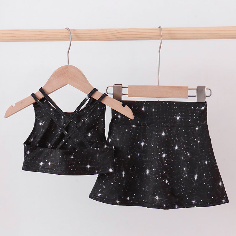 Turn up the sparkle with the Joelle Black Glitter Skort Set, a sleek and stylish two-piece outfit made for girls who love to shine. This set includes a shimmering black glitter crop top paired with a coordinating skort that offers the look of a skirt with the comfort and coverage of built-in shorts.