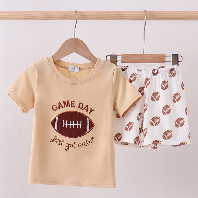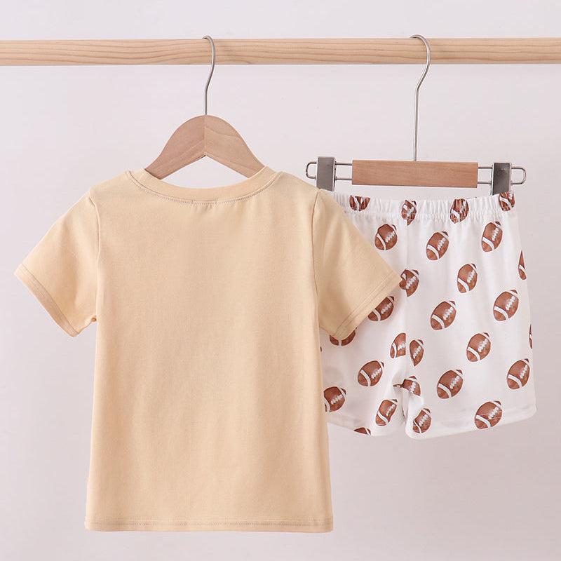 Get your little all-star ready for kickoff in the All-Star Game Day Football Boy Shorts Set. This charming two-piece outfit features a soft short-sleeve tee with a classic football appliqué and playful game day wording, paired with coordinating football-print shorts.