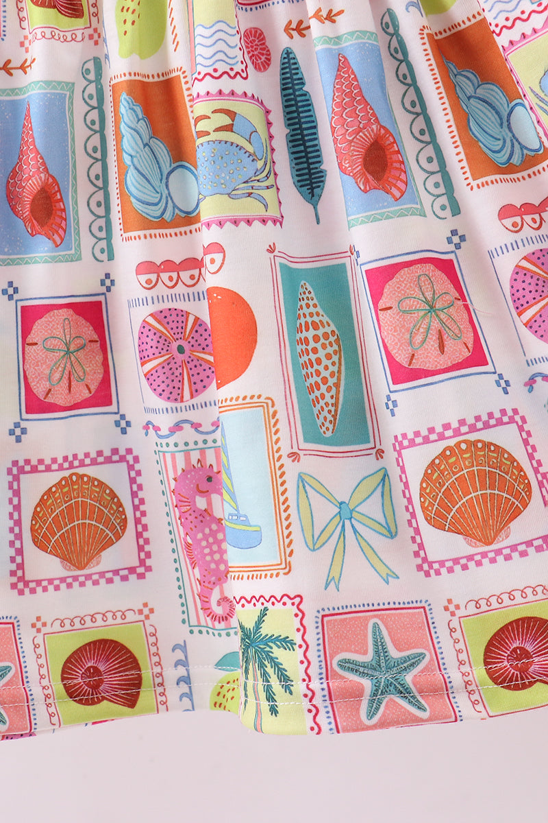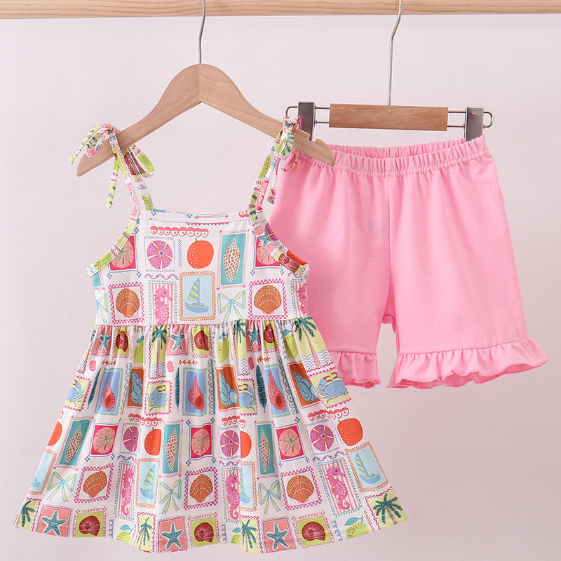 Bring sunny vibes and seaside charm to her wardrobe with the Enjoy the Beach Ruffle Shorts Set. This delightful two-piece outfit features a whimsical beach-inspired print filled with shells, starfish, palm trees, and summer icons, paired with soft pink ruffle shorts for the perfect pop of color.