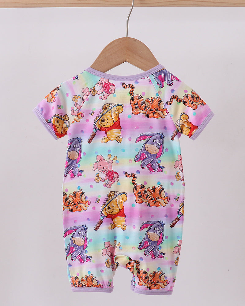 Sweet, playful, and oh-so-soft, our Hundred Acre Rainbow Friends Bamboo Romper brings cheerful storybook charm to your little one’s everyday wear. Featuring a whimsical allover print of friendly woodland pals on a dreamy rainbow pastel background, this romper is bursting with color and joy.