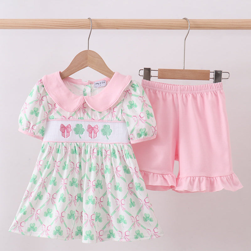 Celebrate lucky little moments in classic style with the Irish Clover Bow Smocked Girl Shorts Set. This charming two-piece outfit features a sweet clover-and-bow print top with a soft pink Peter Pan collar and smocked detail, paired with coordinating pink shorts finished with a playful ruffle hem.