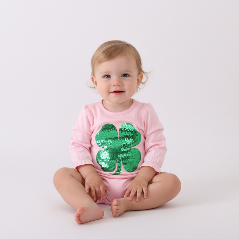 Sprinkle a little extra luck into your little one’s wardrobe with the Little Lucky Clover Glitter Ruffle Bubble. This adorable pink bubble romper features a sparkling green clover design that shines beautifully, making it perfect for festive celebrations and sweet spring days. Soft puff sleeves and gentle ruffle details add a charming, feminine touch.