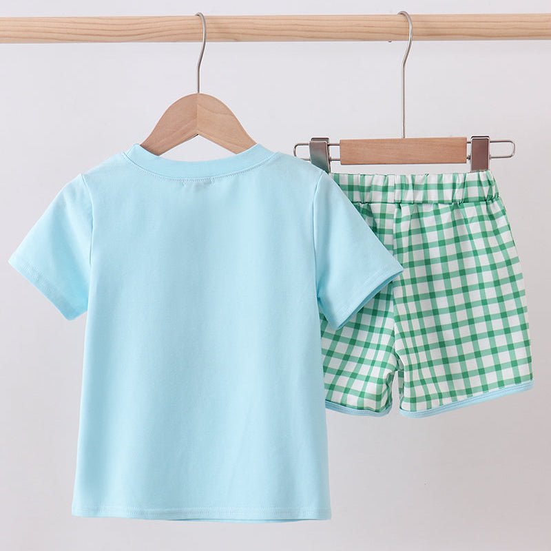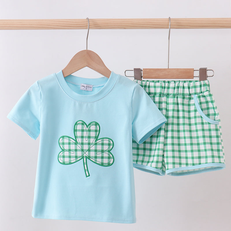 Bring a little luck to his wardrobe with the Lucky Little Shamrock Boy Shorts Set. This festive two-piece outfit features a soft light-blue short-sleeve tee with a playful gingham shamrock applique, paired with coordinating green gingham shorts for a classic seasonal look.
