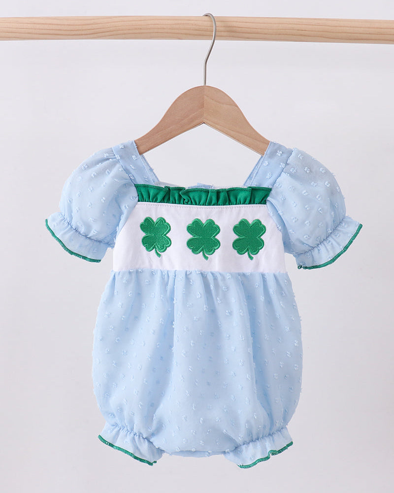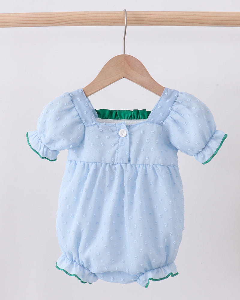 Sweetly festive with a timeless feel, the Lucky Shamrock Swiss Dot Girl Bubble is perfect for celebrating St. Patrick’s Day in classic style. This precious bubble romper features a soft blue Swiss dot fabric accented with charming green shamrock embroidery across the chest. Puff sleeves, gentle ruffle trim, and delicate green piping add an heirloom-inspired touch.