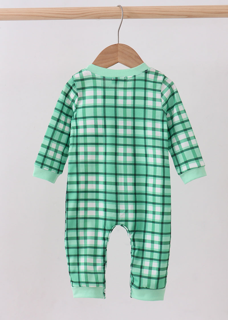 Dress your little lucky charm in the Shamrock Stroll Embroidered Gingham Baby Romper. Featuring a classic green gingham pattern with festive parade-inspired embroidery across the chest, this romper blends seasonal charm with everyday comfort. Soft mint trim at the neckline, cuffs, and ankles adds a sweet finishing touch.