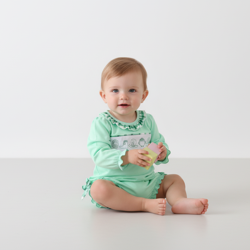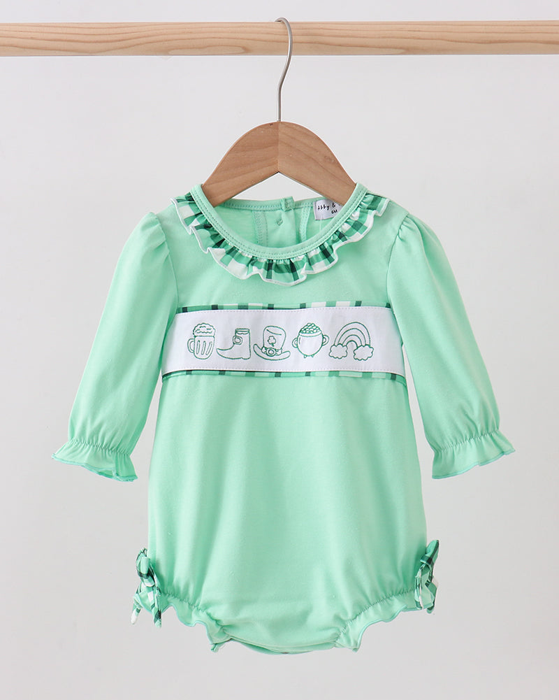 Sweet, festive, and full of charm, the Shamrock Stroll Embroidered Ruffle Bubble is perfect for celebrating lucky little moments. This darling bubble romper features a soft mint-green hue with delicate parade-inspired embroidery across the chest, trimmed with classic gingham accents for a timeless look. Ruffle details at the neckline, sleeves, and leg openings add an extra touch of sweetness.