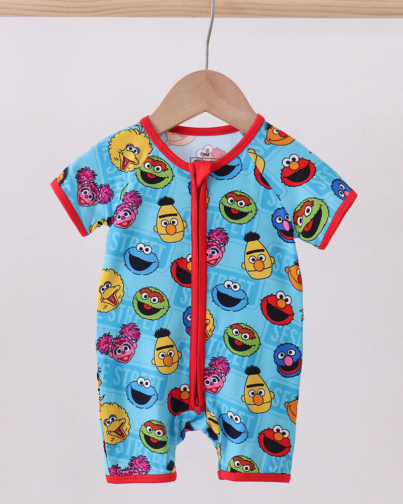 Bring big smiles and bright color to baby’s wardrobe with the Sunny Street Friends Bamboo Baby Romper. This adorable one-piece features an allover print of cheerful, friendly character faces on a vibrant aqua background, finished with bold red trim for a fun, playful look.