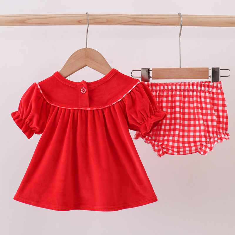 Dress your little one in timeless holiday charm with our Ruby Bows Velvet Baby Bloomer Set — a classic and cozy outfit perfect for festive celebrations and family portraits. The soft red velvet top features delicate embroidered white bows across the yoke and gingham piping for a sweet, traditional touch.