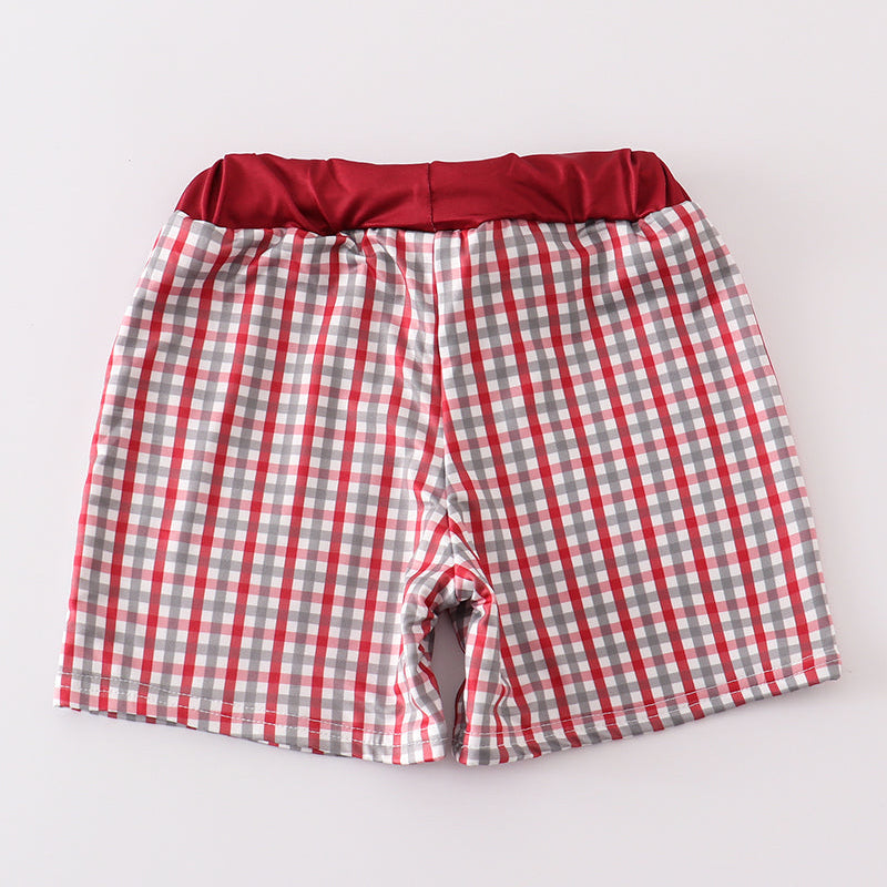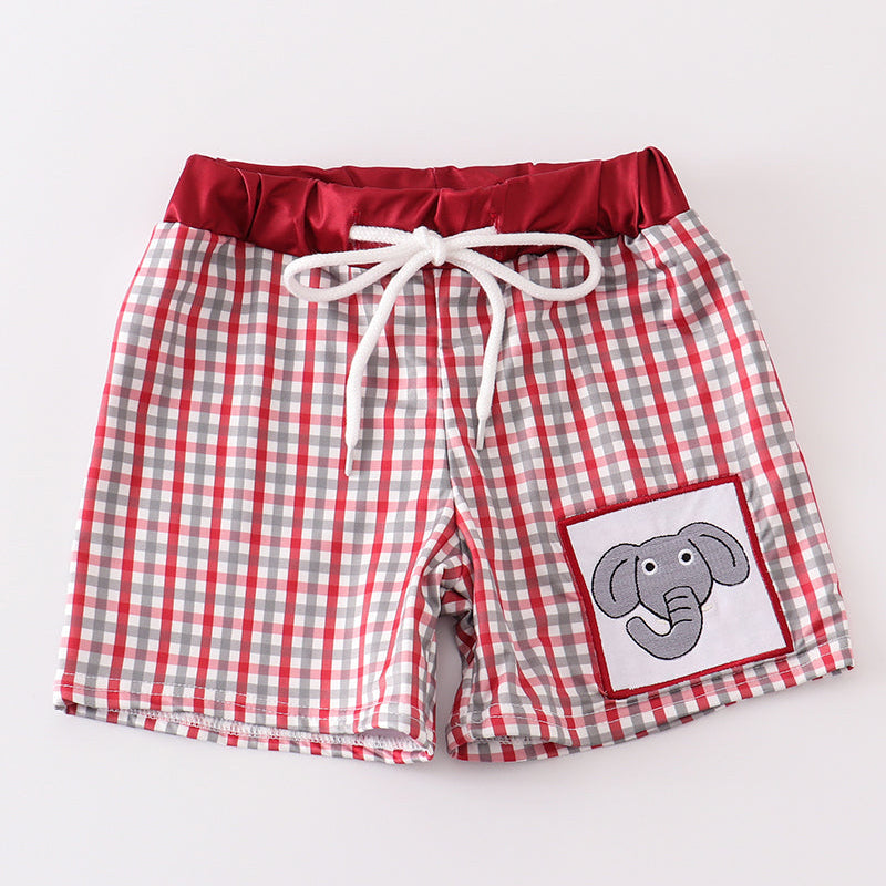 Make a splash all summer long with our Roll Tide Splash Plaid Swim Trunks! Featuring a classic crimson and gray plaid pattern and an adorable elephant applique pocket, these swim shorts are perfect for pool days, beach trips, lake weekends, and tailgate season. The adjustable drawstring waist ensures a comfortable fit, while the quick-dry fabric keeps little boys ready for fun in and out of the water. Cute, sporty, and southern-inspired—these trunks are a game-day favorite for your little fan!