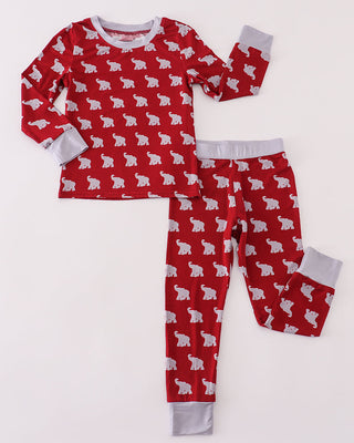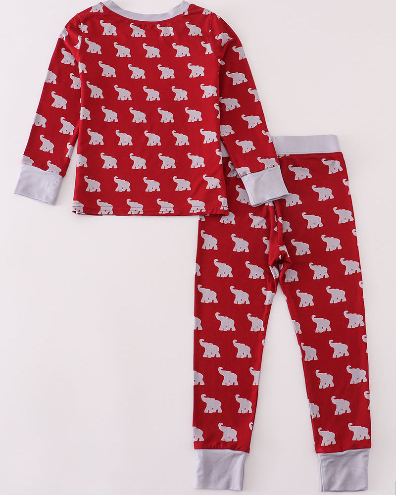 The deep crimson background features an adorable repeating elephant print, paired with contrast cuffs for a classic, polished look. Stretchy, tagless, and gentle on sensitive skin, these pajamas are perfect for year-round snoozing, lounging, or Saturday-morning cartoons.