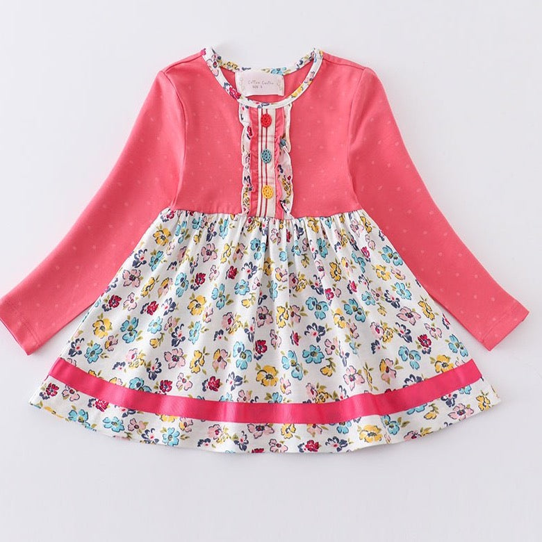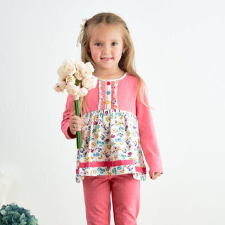 Brighten up her wardrobe with the charming Amora Pink Polka Dot Floral Print Tunic Girl Top. This adorable tunic features a vibrant pink bodice with subtle polka dot detailing, long sleeves for cozy comfort, and a playful floral printed skirt that adds a touch of whimsy. The button-up ruffle placket adorned with colorful buttons adds a cute, vintage-inspired flair. Perfect for casual outings, playdates, or family gatherings, this tunic top pairs beautifully with leggings or jeans for an effortlessly cute look.