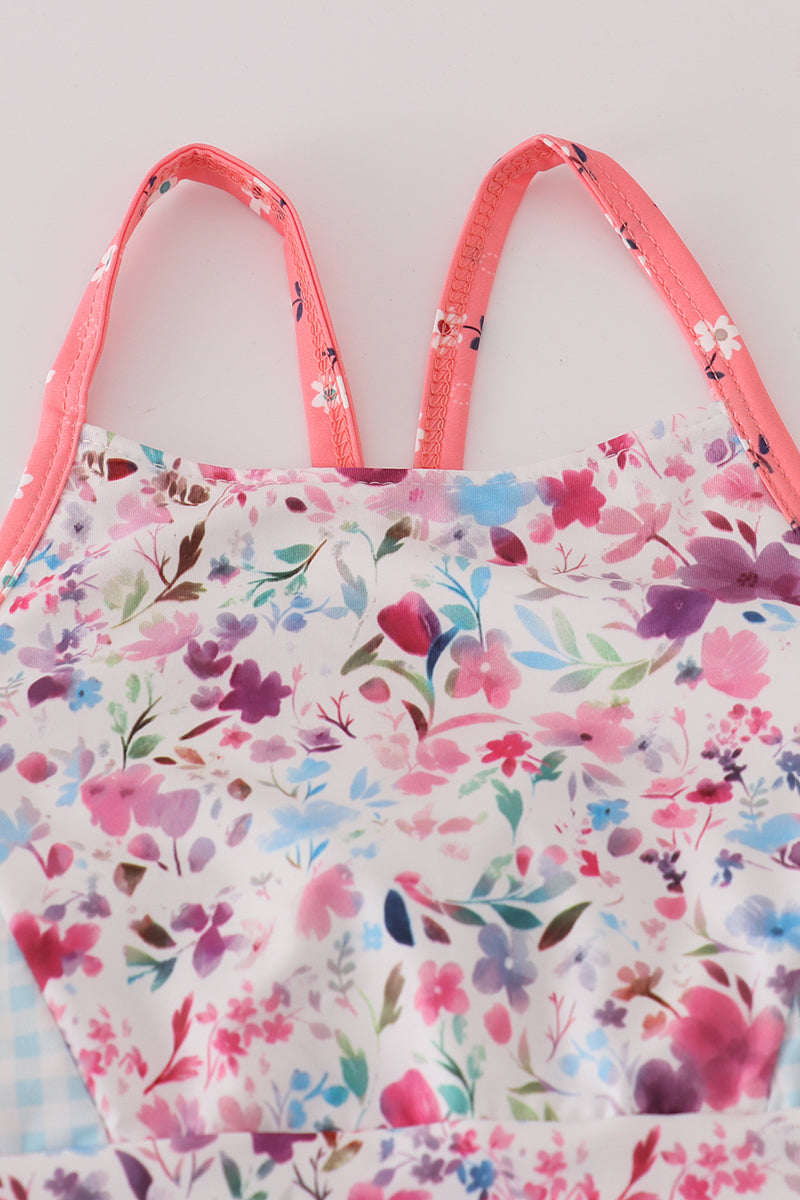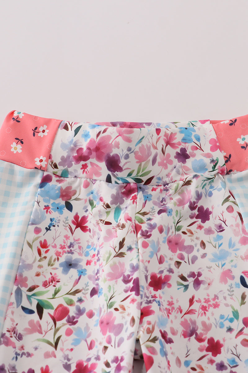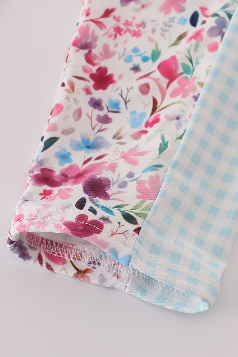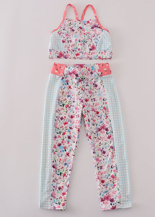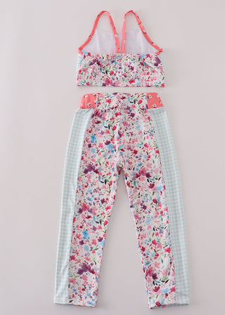 Bright, cheerful, and made for movement—the Ansley Floral Gingham Active Leggings Set is the perfect blend of sporty and sweet. This two-piece outfit features a floral-print athletic top paired with coordinating leggings accented with soft blue gingham side panels. The stretchy, breathable fabric keeps her comfortable whether she’s at practice, at play, or on the go.