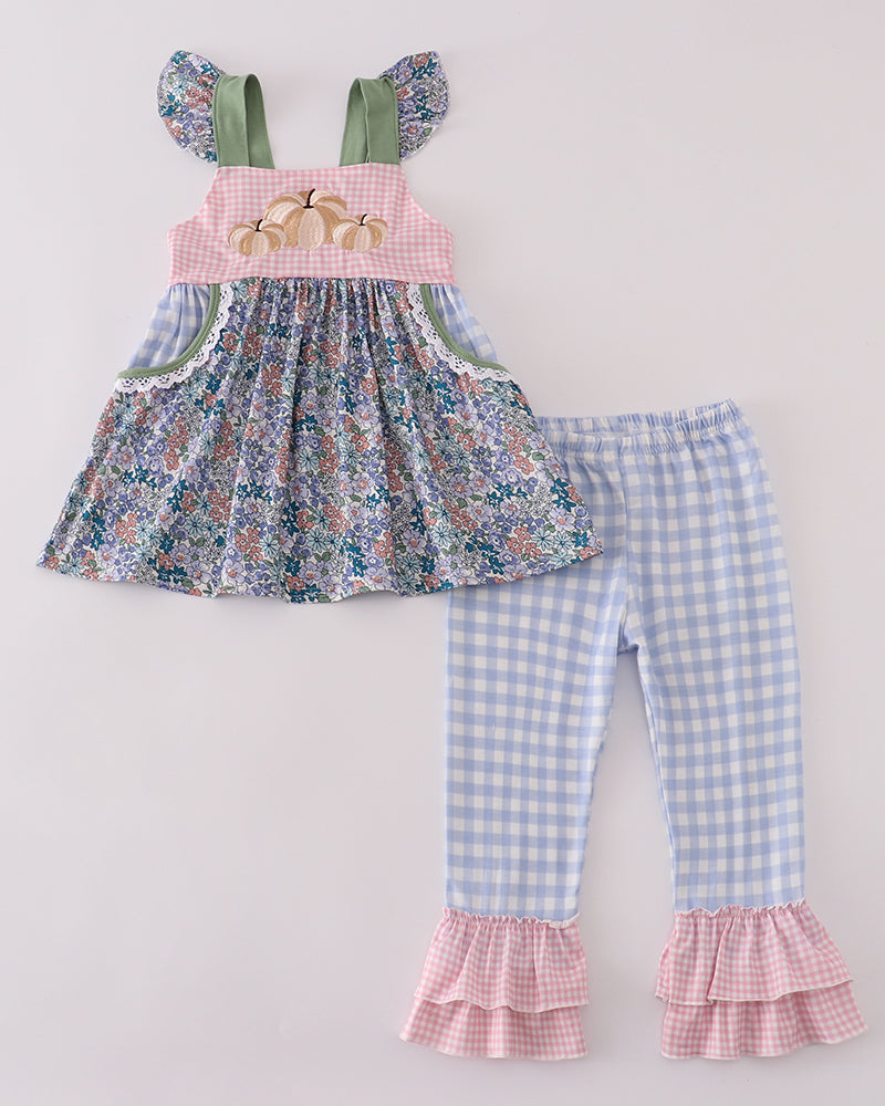 Keywords: fall pumpkin outfit for girls, boutique ruffle pants set, embroidered pumpkin top, gingham and floral girl outfit, fall toddler clothes, autumn harvest outfit, girls Thanksgiving outfit, ruffle pants fall set.