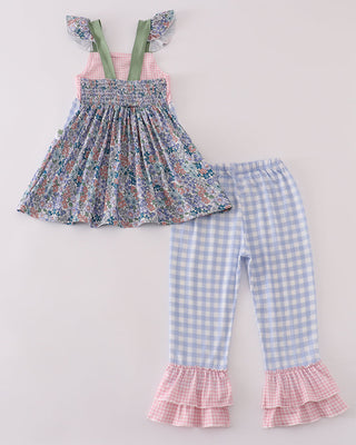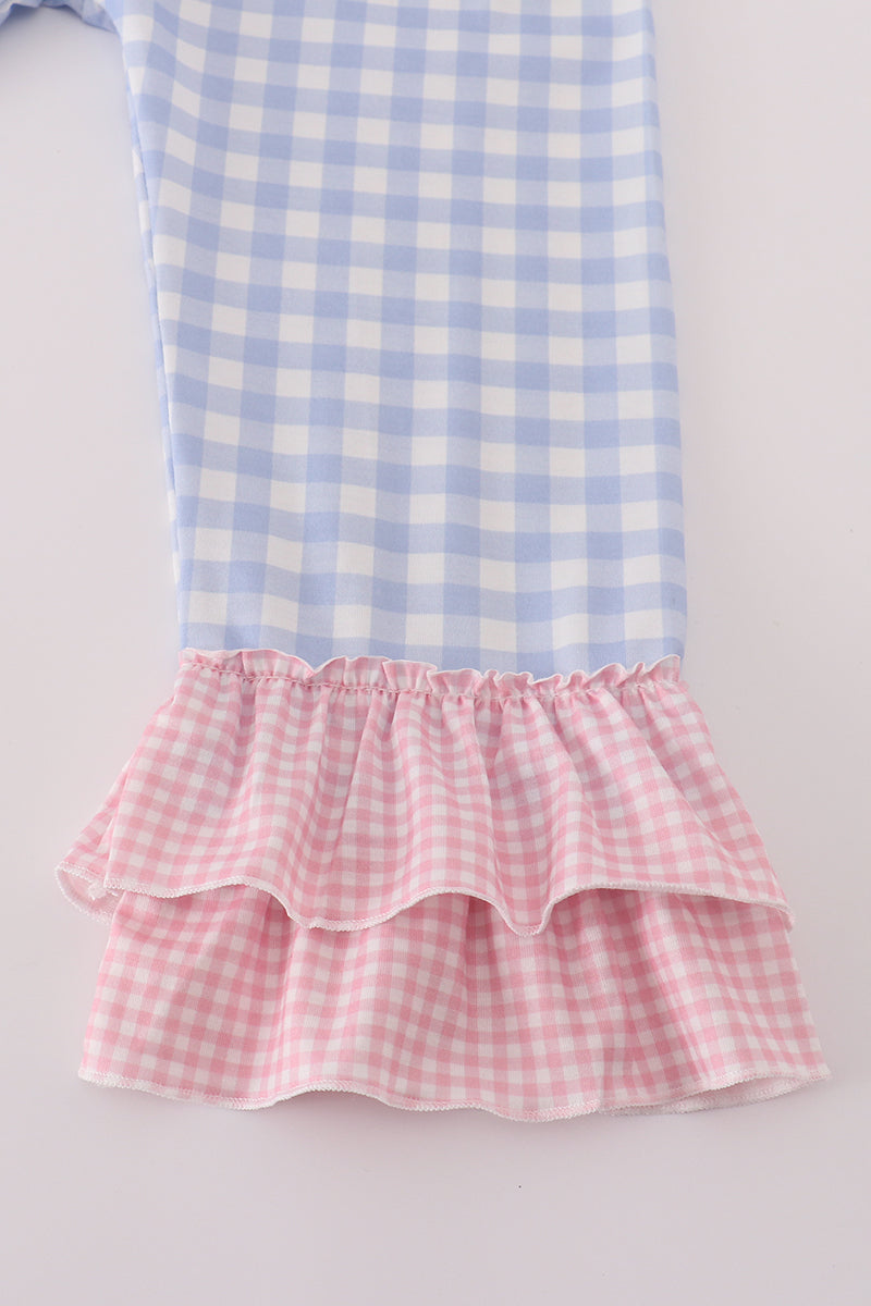 Celebrate the sweetness of fall in style with our Autumn Meadow Pumpkin Embroidered Ruffle Pants Set. This boutique-worthy ensemble features a beautifully detailed pumpkin embroidery across a pink gingham bodice, perfectly complemented by floral flutter sleeves and skirt. The coordinating pants showcase a light blue gingham print with layered pink ruffle cuffs, adding extra flair and fun to every step. Crafted with comfort and cuteness in mind, this set is ideal for trips to the pumpkin patch, family photos, or festive fall outings. It’s the perfect mix of playfulness and classic charm for your little one’s autumn wardrobe.
