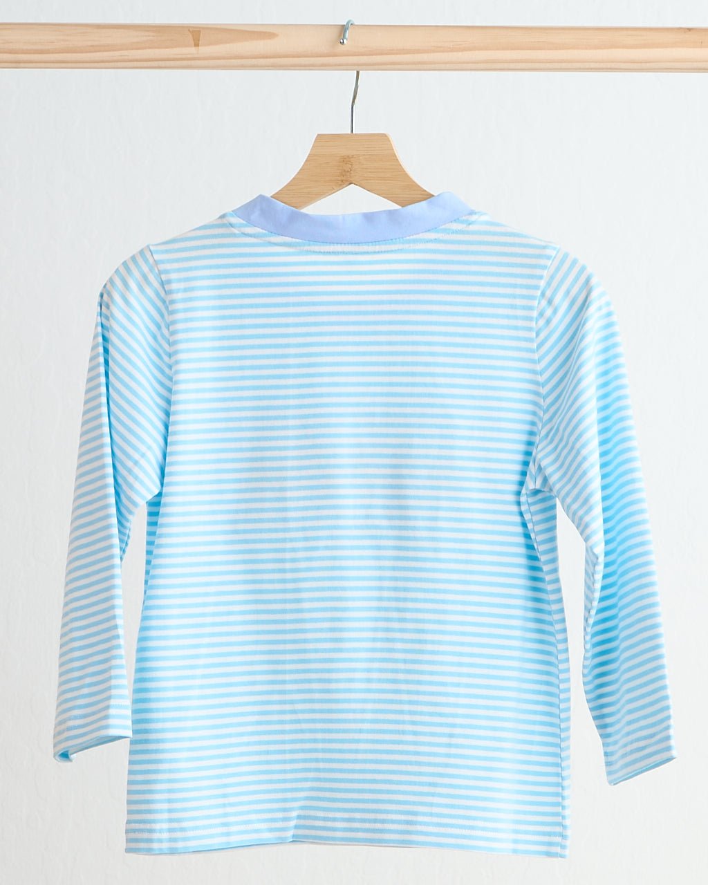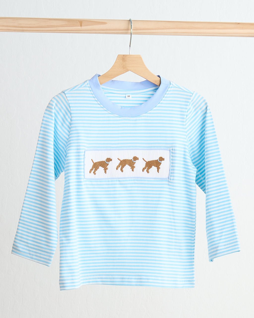 Bring timeless charm to your little one’s everyday look with our Puppy Playtime Smocked Stripe Boy Top. This classic shirt features hand-smocked puppy embroidery on a soft blue and white striped knit — a perfect blend of comfort, style, and playfulness.