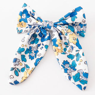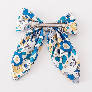 Add a touch of charm to any outfit with our Cambria Blue Floral Print Hair Bow. Featuring a fresh mix of blue and yellow blossoms on a crisp white background, this bow is perfect for everyday wear, school, or special occasions. Its boutique-style design with long tails makes it a statement accessory while still being lightweight and comfortable for little ones. Whether paired with dresses, casual sets, or seasonal outfits, this bow adds the perfect finishing touch.