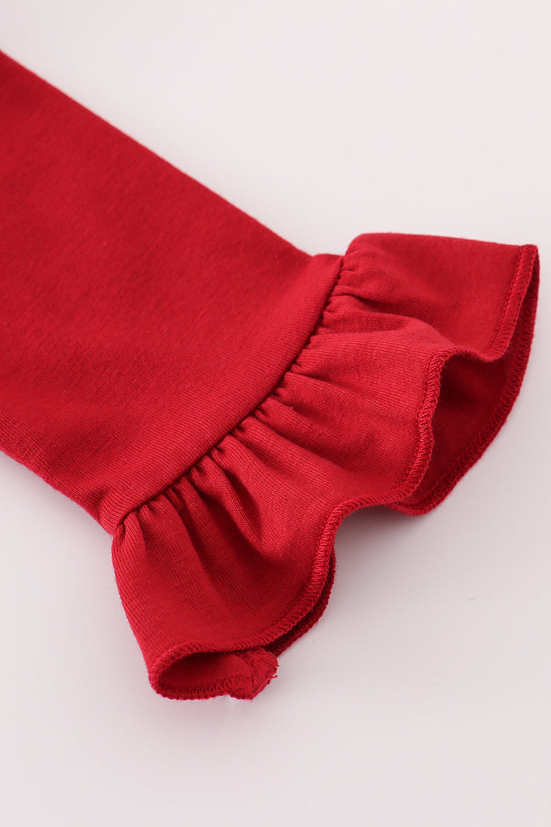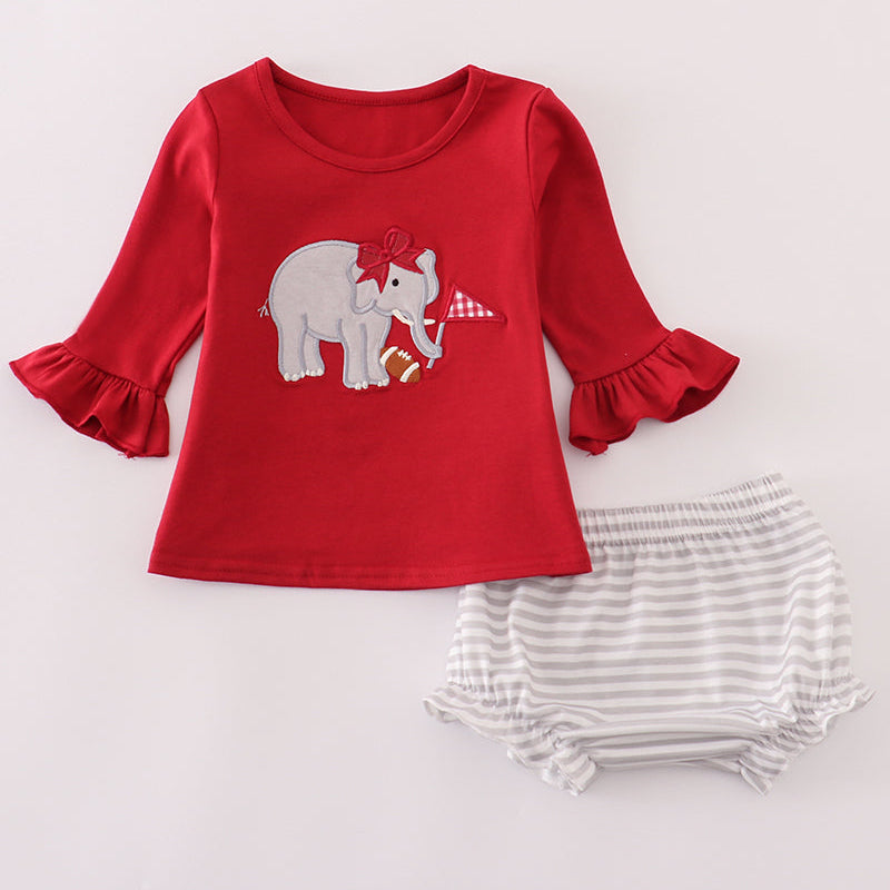 Let your little one shine with spirited sweetness in the Crimson Cheer Elephant Ruffle Bloomer Set! This adorable ensemble features a vibrant crimson top with playful ruffle sleeves and a precious elephant applique carrying game-day essentials — complete with a bow for the perfect girly touch.