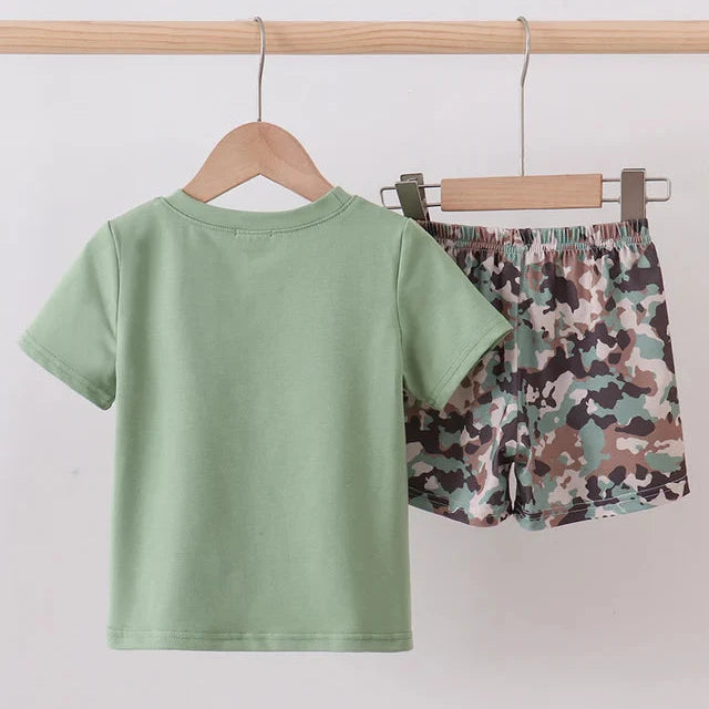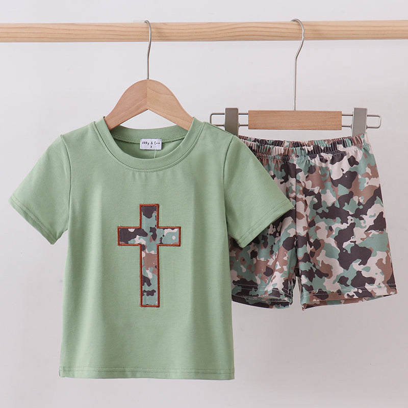 The Cross & Courage Camo Boy Shorts Set is a meaningful and stylish outfit designed for active little boys. This two-piece set features a soft sage green short-sleeve tee with a camo cross appliqué, paired with coordinating camouflage shorts for a comfortable, everyday look.