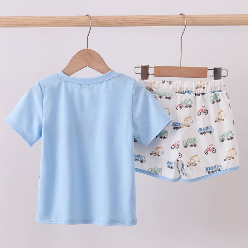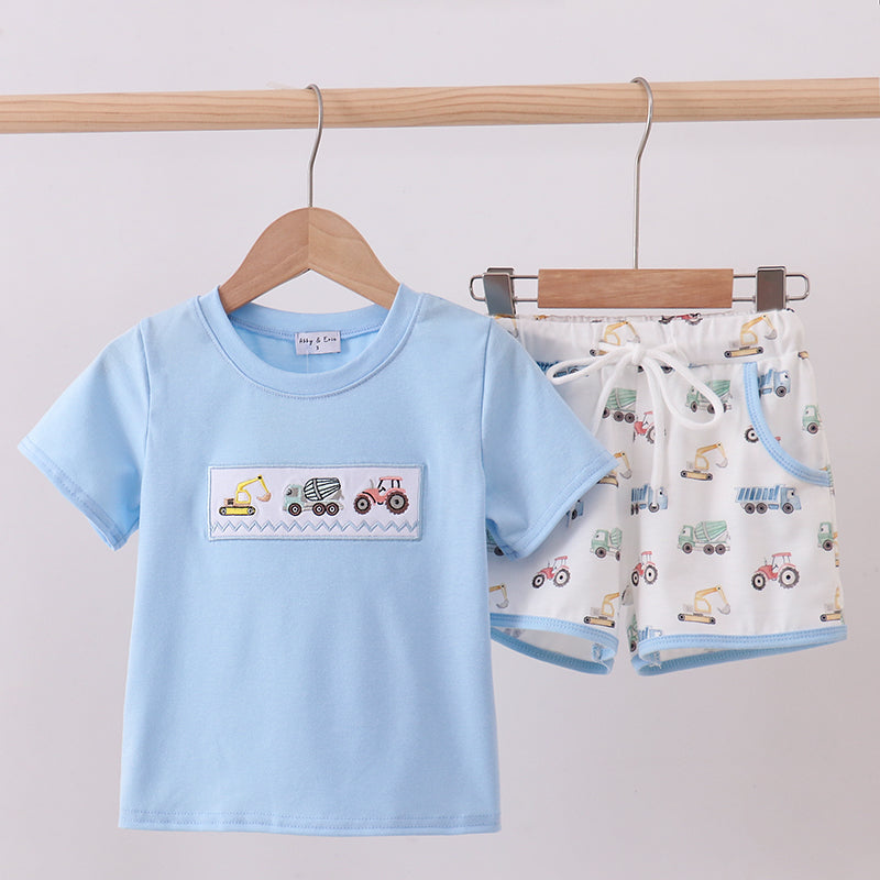 The Dig & Drive Construction Embroidered Boy Shorts Set is a fun and playful outfit made for little builders on the move. This two-piece set includes a soft light blue short-sleeve tee with charming embroidered construction vehicles across the chest, paired with matching drawstring shorts featuring an all-over construction print.