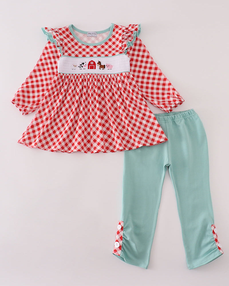 Bring farmyard fun to her wardrobe with our Down on the Farm Smocked Ruffle Pants Set! This adorable outfit features a red gingham smocked top beautifully embroidered with classic barn animals — cow, sheep, horse, and pig — for the sweetest country charm.