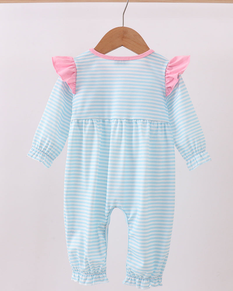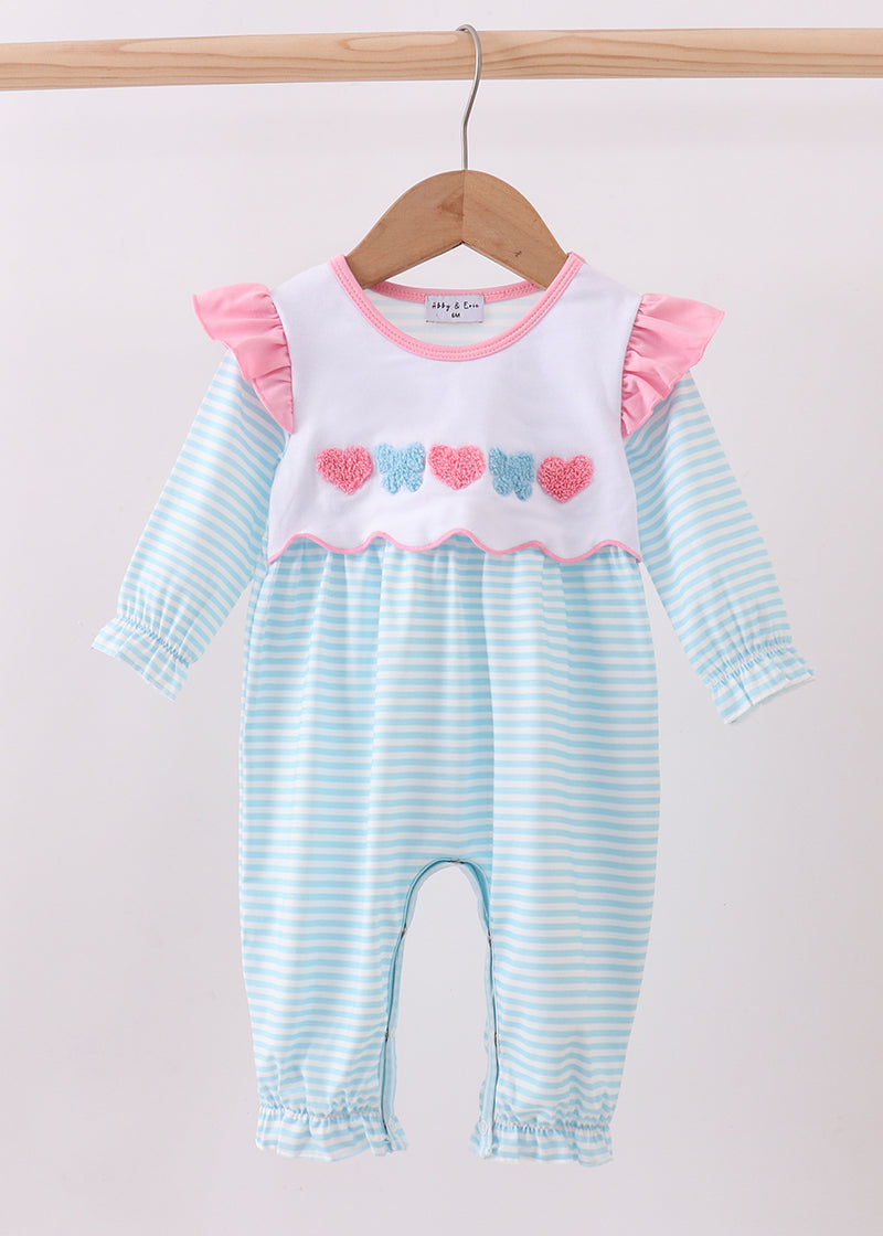 Delicate details meet adorable charm in our French Knot Blue Bows & Hearts Ruffle Romper. This sweet romper features a soft blue–stripe body paired with a crisp white bodice adorned with hand-stitched French knot hearts and bows in pastel pink and blue. The scalloped trim and flutter ruffle sleeves add the perfect boutique touch.