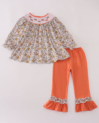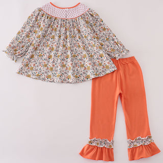 Keywords: floral ruffle pants set, fall toddler outfit, smocked baby girl set, embroidered girl clothes, Thanksgiving girl outfit.