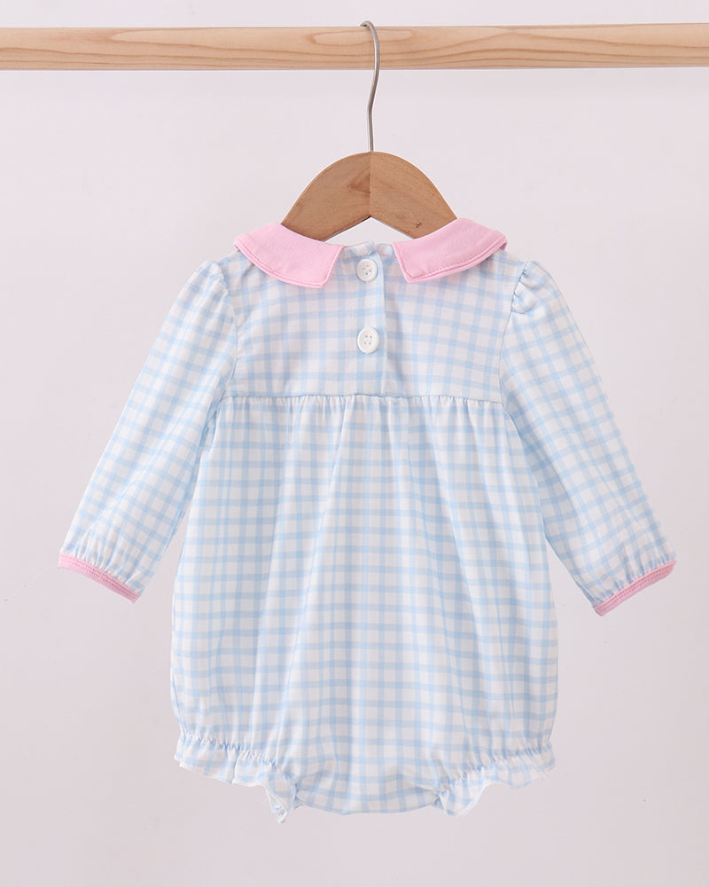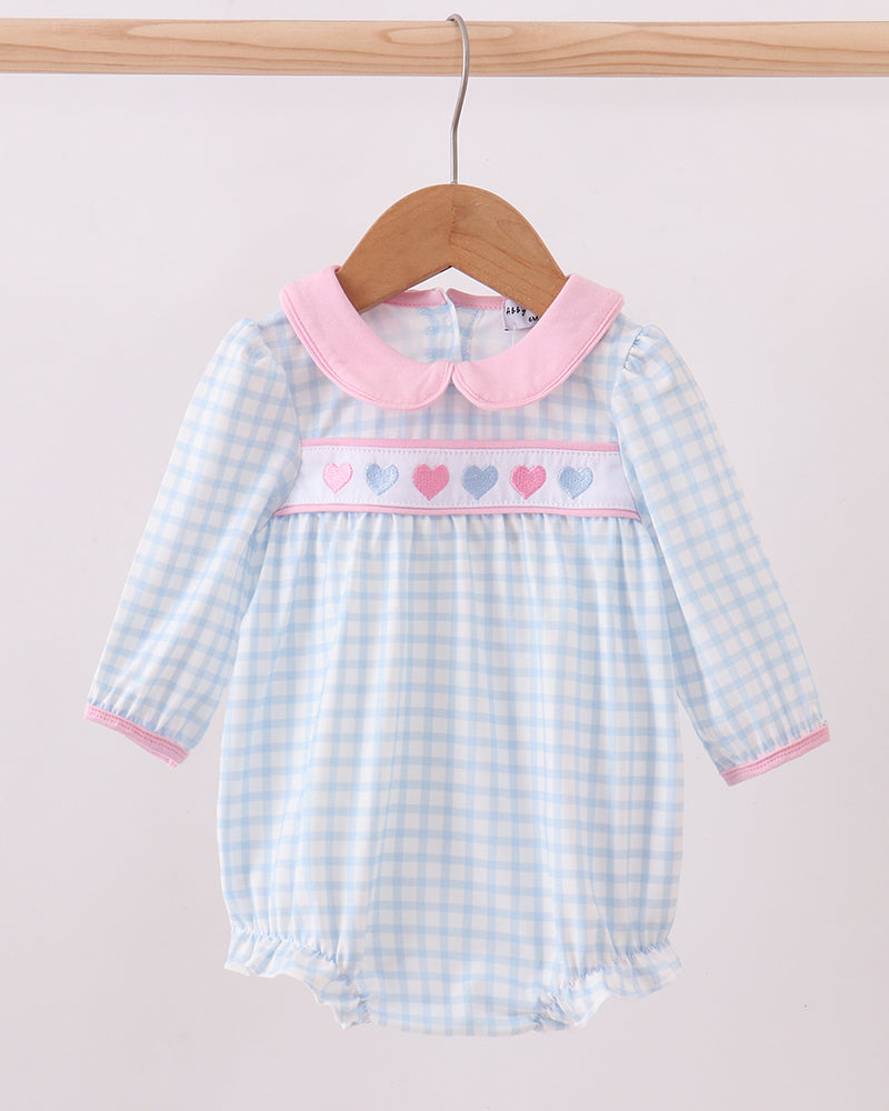 Soft, classic, and irresistibly sweet, our Hearts & Gingham Baby Bubble brings timeless charm to your little one’s wardrobe. Designed in a light blue gingham pattern, this darling bubble features a row of embroidered pastel hearts across the chest—adding the perfect touch of Valentine sweetness all year long.