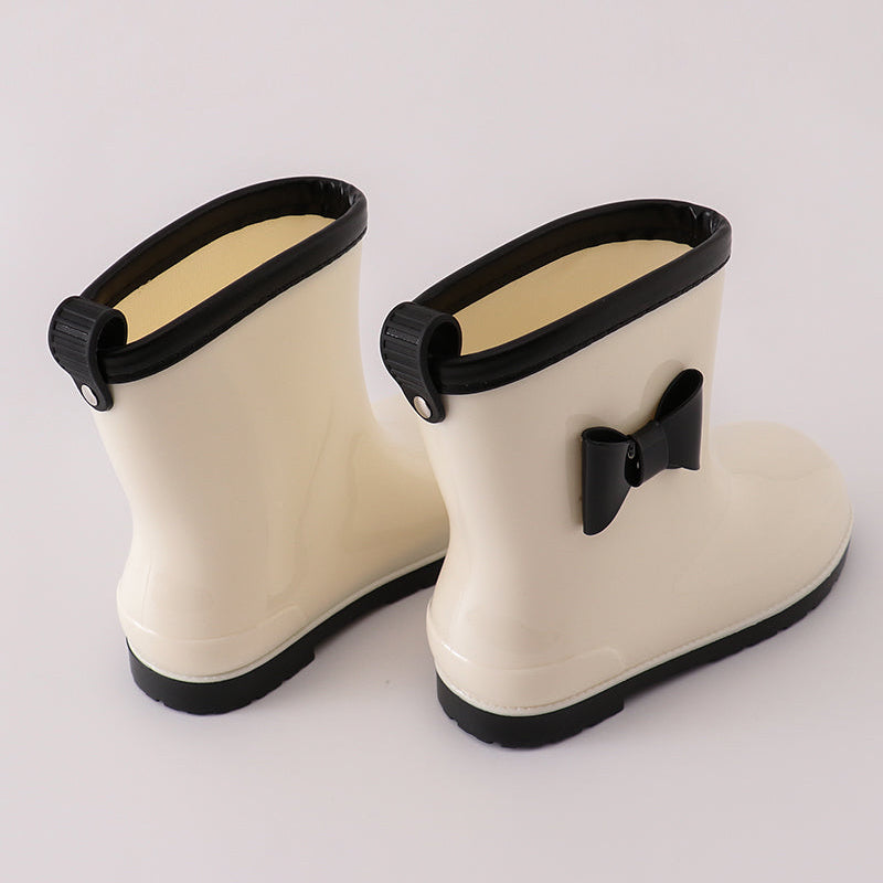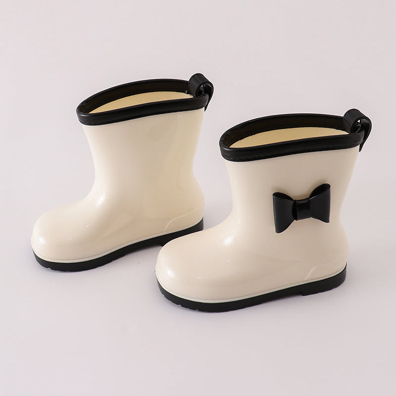 - 🤍 Cream-white glossy rain boot with black bow detail