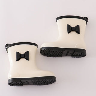 Bring a touch of classic charm to rainy-day adventures with the Iris White + Black Bow Rain Boots! These chic cream-white boots feature a glossy finish, contrasting black trim, and an adorable black bow accent—perfect for adding style to puddle jumping, school days, and drizzly outings.