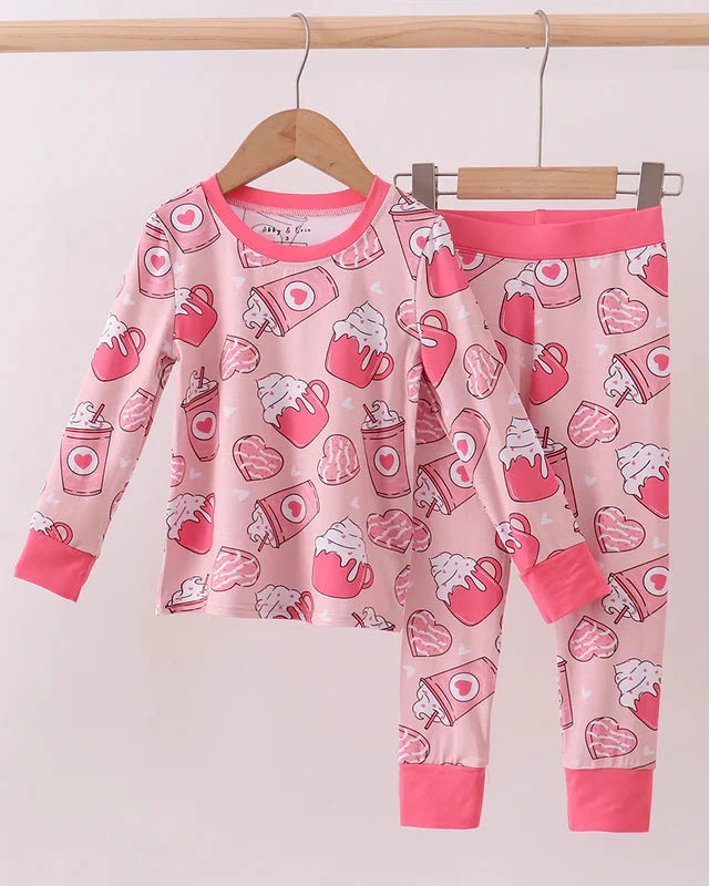 Cozy, cute, and full of sweet Valentine charm, our Love Latte Bamboo PJ Set is the perfect blend of comfort and festive fun. Made from buttery-soft, stretchy bamboo fabric, this pajama set features an irresistible pink print of whipped-cream lattes, heart drinks, and sweet treats—designed for little ones who love all things cozy and cute.
