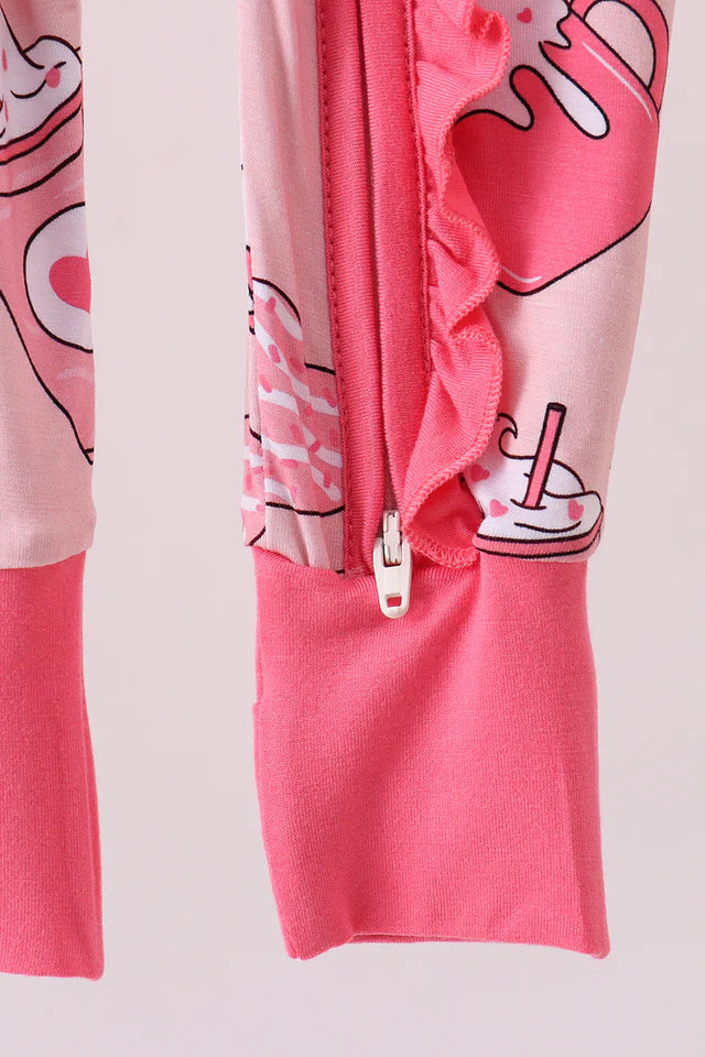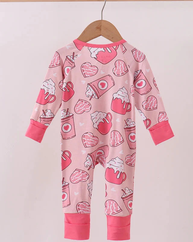Serve up the sweetest Valentine style with our Love Latte Ruffle Zip Bamboo Romper. Made from ultra-soft, breathable bamboo fabric, this darling sleeper is covered in whimsical latte cups, whipped–cream treats, and sweet heart motifs—perfect for your little lovebug.