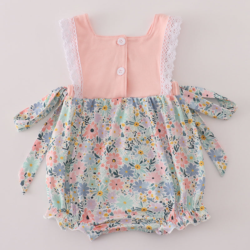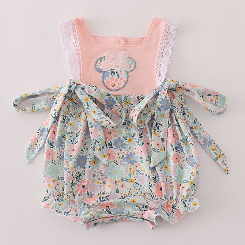 Say hello to the sweetest springtime style! Our Meadow Magic Mouse Ruffle Bubble is bursting with floral charm, pastel tones, and an adorable mouse applique topped with a dainty bow. The flutter lace shoulder trim and oversized side ties add a whimsical boutique touch, while the gathered bubble silhouette keeps baby comfy and picture-perfect.