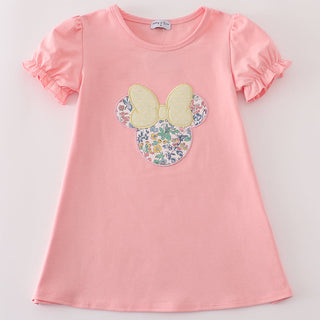Sweet, soft, and full of charm, the Meadow Magic Mouse Dress is the perfect everyday outfit for your little girl. Made in a pretty blush pink with a floral mouse silhouette and a pastel bow applique, this dress blends whimsy with comfort. The flutter ruffle sleeves add an adorable touch, while the relaxed A-line fit makes it easy for twirling, play, and picture-perfect days.