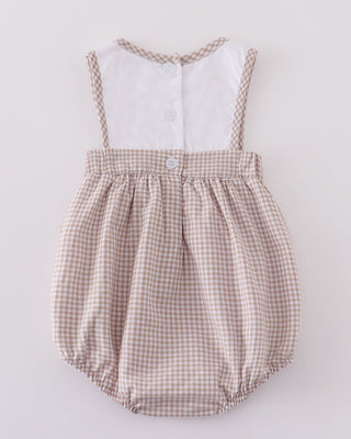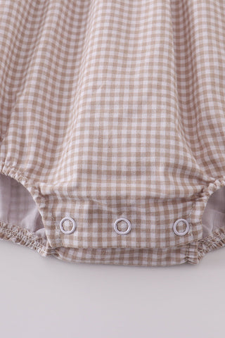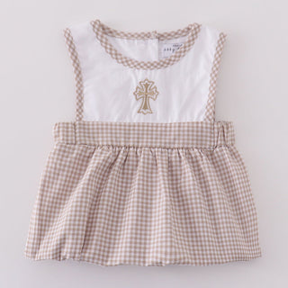 This sweet bubble features a soft beige gingham fabric with a crisp white yoke, delicately embroidered with a gold cross for a touch of elegance and devotion. The piped gingham trim and gentle pleating add a refined, heirloom feel, while the bottom snaps make diaper changes a breeze.
