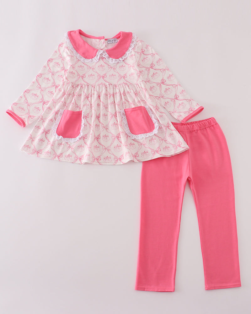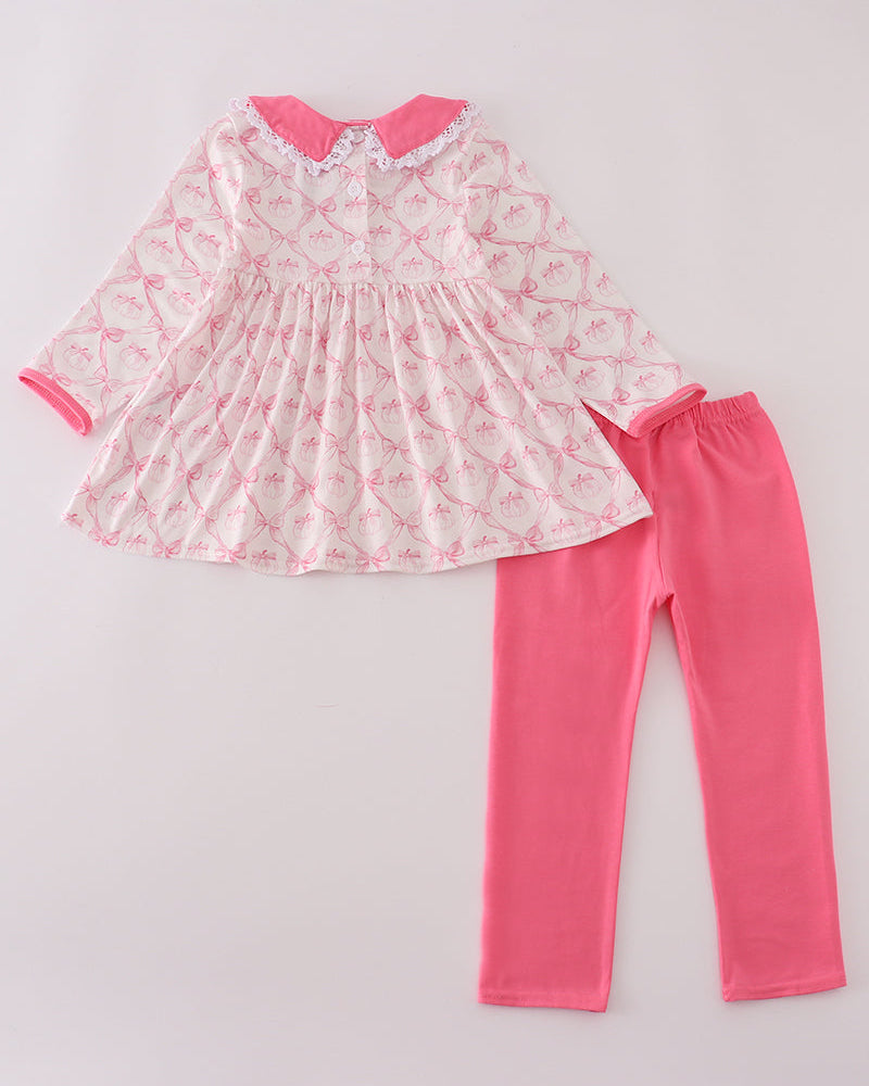 Make her fall wardrobe royally sweet with our Pumpkin Princess Bow Girl Pants Set. This darling two-piece outfit features a long-sleeve peplum top with a dainty pink bow-and-pumpkin print, scalloped lace-trimmed patch pockets, and a contrasting Peter Pan collar in vibrant pink. Soft and stretchy matching pink pants complete the look—perfect for playdates, pictures, or pumpkin patch strolls.