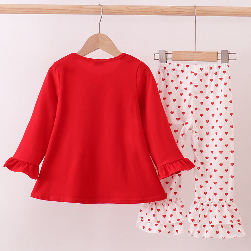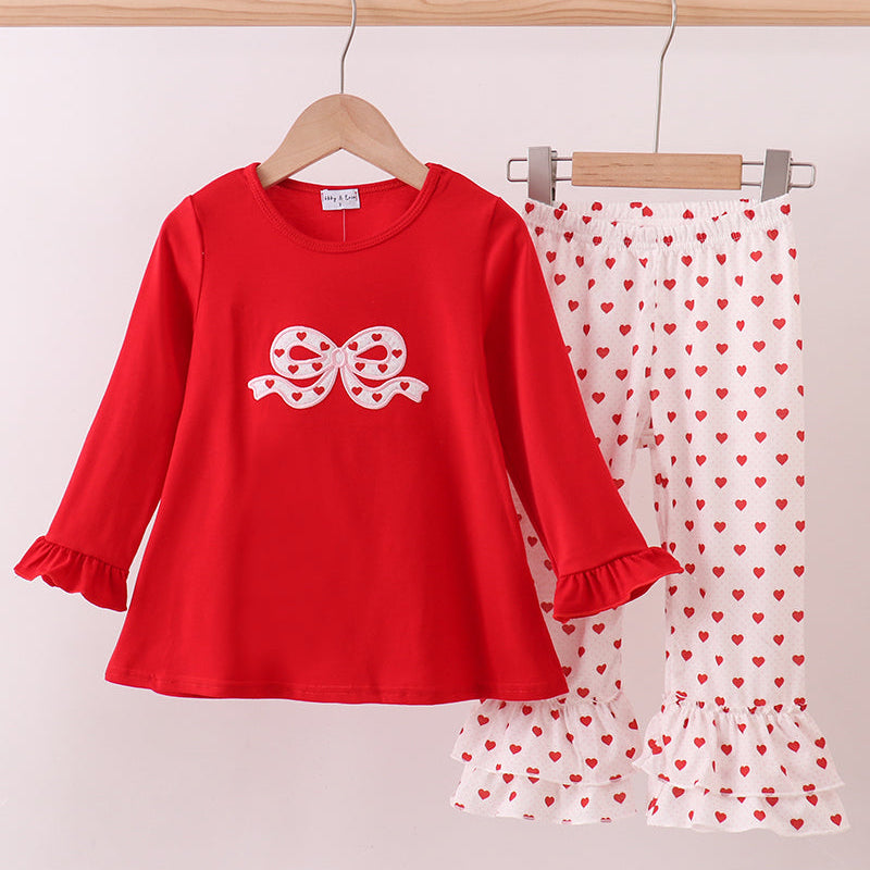 Celebrate love in the sweetest style with our Sweetheart Bow Ruffle Pants Set. This charming two-piece outfit includes a bright red long-sleeve top adorned with an adorable heart-print bow applique. Paired with matching white pants covered in tiny red hearts and finished with double ruffle hems, this set is irresistibly cute and perfect for Valentine’s season.