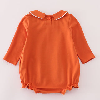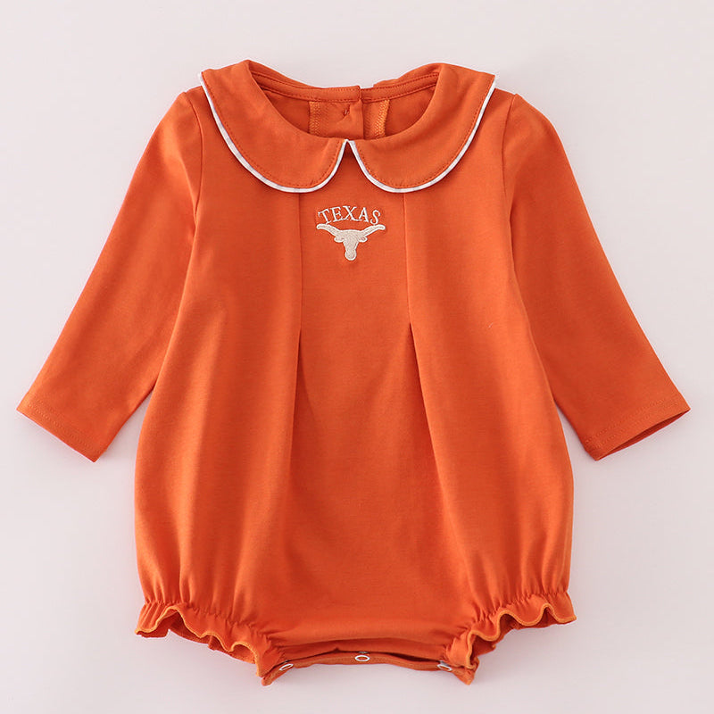 Dress your little Longhorn fan in adorable team spirit with our Hook ’Em Cutie Texas Bubble! This burnt-orange girls’ bubble features a sweet Peter Pan collar trimmed in white piping and a beautifully embroidered Texas Longhorn emblem at the chest. Soft, breathable fabric keeps her comfy all day, while the gathered bubble silhouette adds the perfect touch of charm. Snaps at the bottom make changes quick and easy—perfect for game days, family photos, and every Texas-sized moment in between.