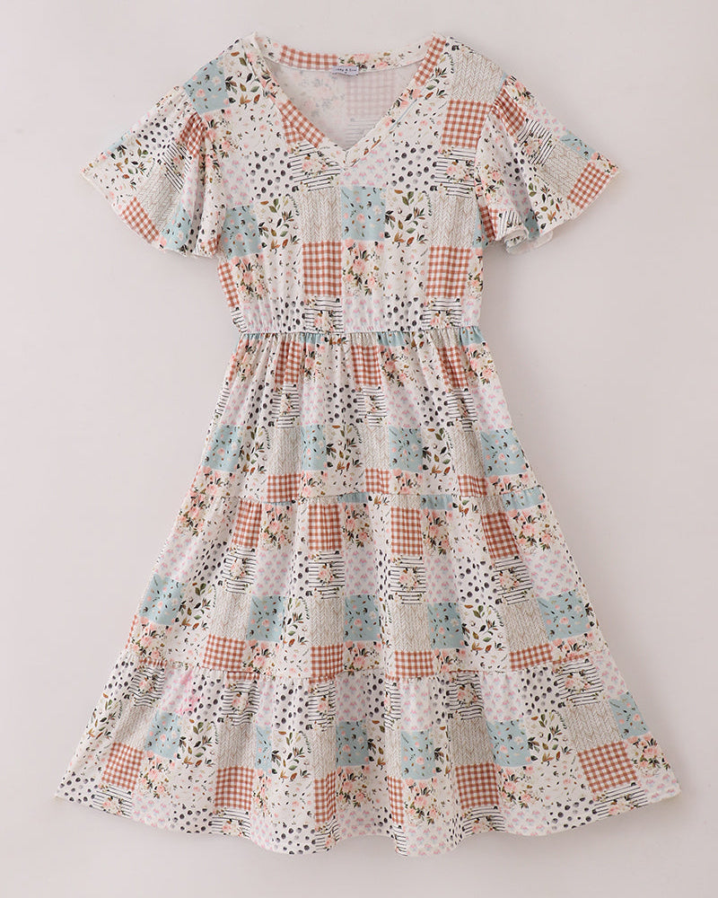 Celebrate the beauty of fall in style with the Thanksgiving Floral Patchwork Print Women’s Dress. Designed with a flattering V-neckline and flowing tiered silhouette, this dress features a charming patchwork print of florals, gingham, polka dots, and fall-inspired patterns in warm, earthy tones. The elastic waistband offers a comfortable, feminine fit, while the short flutter sleeves add a touch of playful grace.