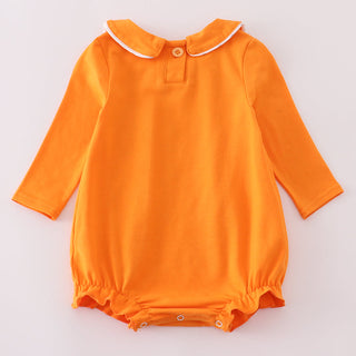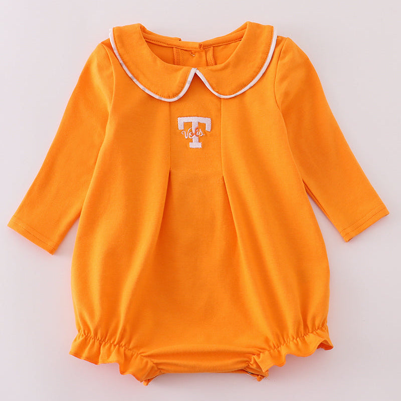 Your littlest fan will be game-day ready in the Game Day Vols Ruffle Bubble! This adorable orange bubble features a classic peter pan collar trimmed in white, sweet ruffle leg openings, and an embroidered “T Vols” emblem front and center for the perfect Tennessee spirit.