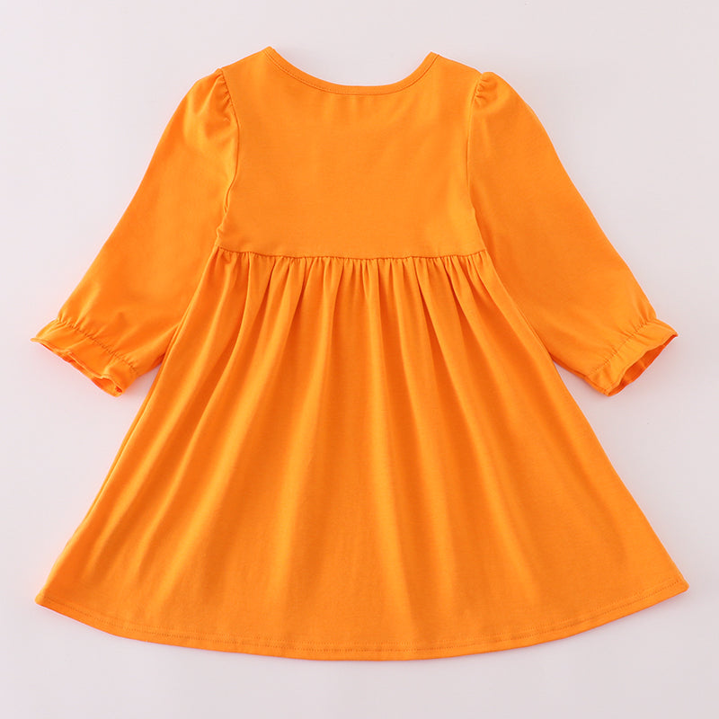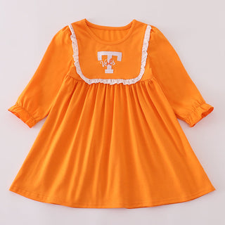 Dress her in true Tennessee spirit with our Game Day Vols Ruffle Dress! Made in the signature Big Orange, this sweet long-sleeve dress features a precious ruffled bib front with an embroidered “T Vols” design — perfect for cheering on her favorite team.