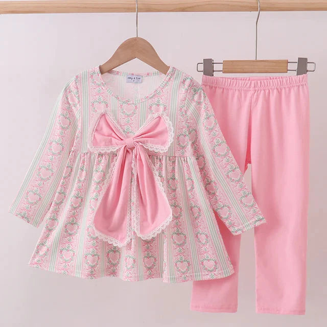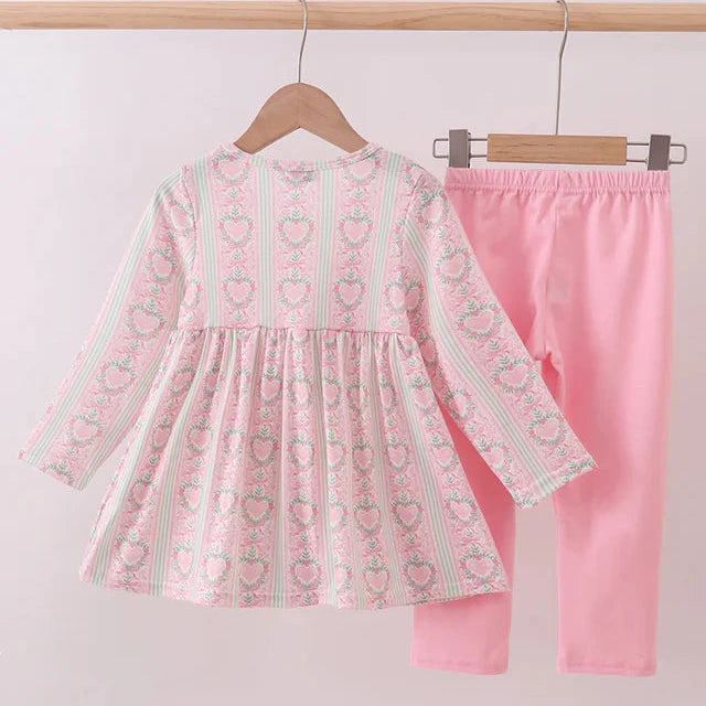 Paired with coordinating pink pants, this set blends comfort with elegance—ideal for Valentine’s parties, photos, family outings, or everyday sweetness. The long sleeves, gentle gathers, and soft fabric make it as cozy as it is adorable.