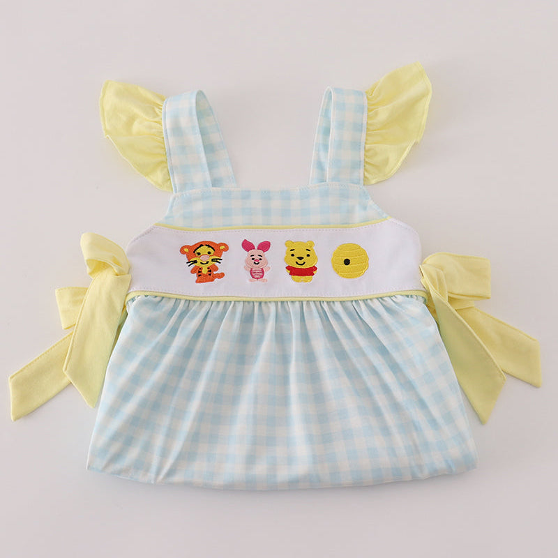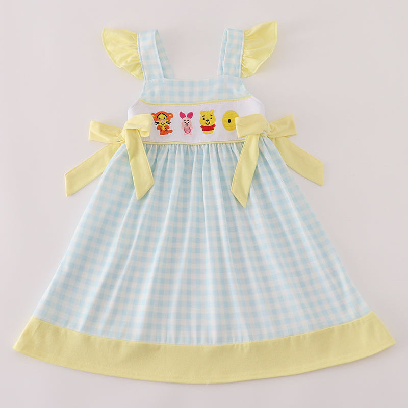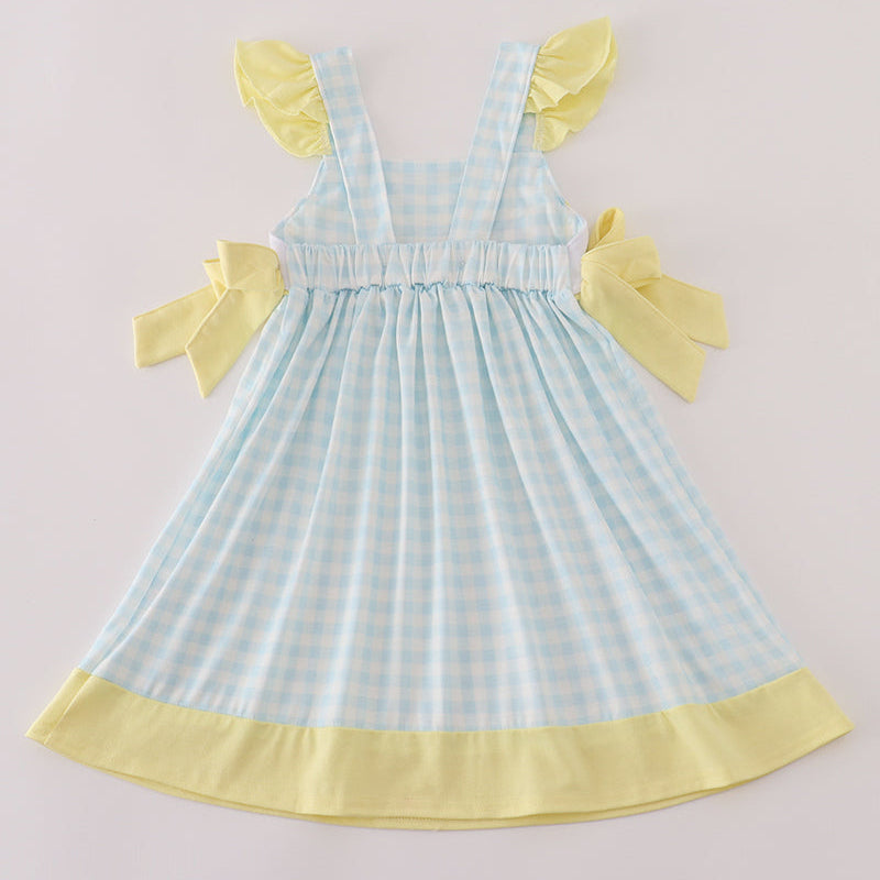 The sleeveless design includes fluttery yellow ruffle straps and matching side bows that tie into perfect little accents. A coordinating yellow hemline frames the airy gingham skirt, giving the dress a gently flowing silhouette that’s ideal for twirling, photos, and sunny-day outings.