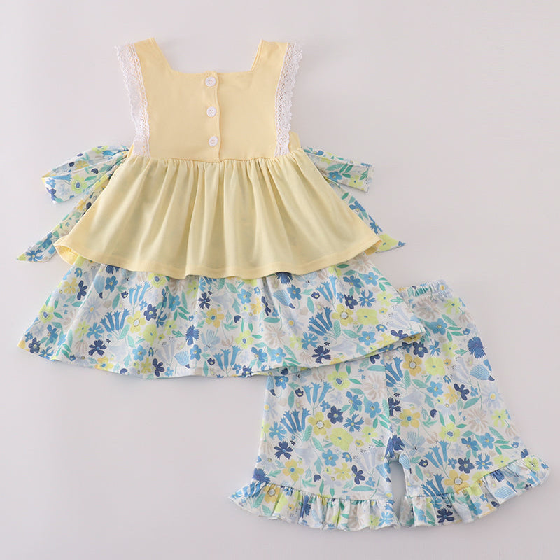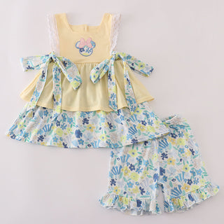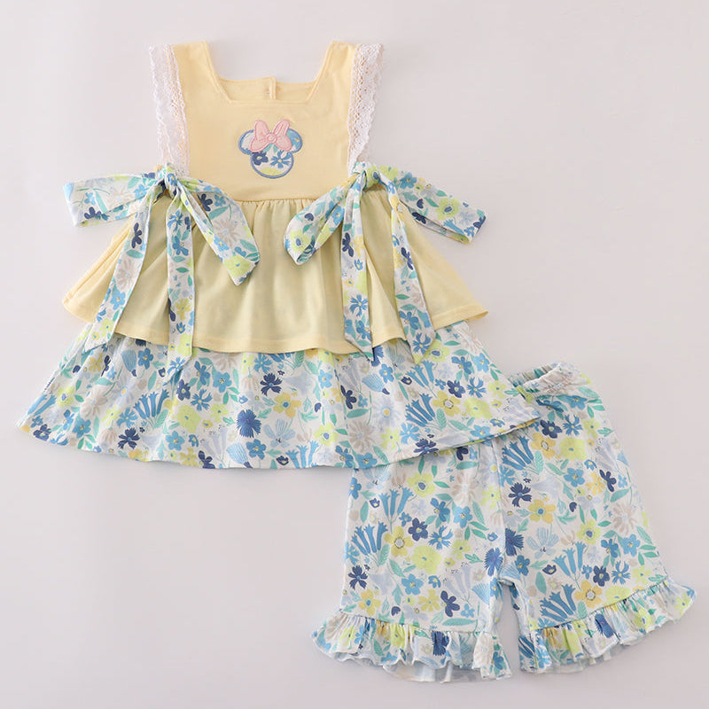 Bring sunshine and sweetness to her days with the Sunny Floral Magic Mouse Applique Girl Shorts Set. This darling outfit features a soft yellow layered top with delicate lace straps, side tie bows, and a charming floral mouse applique for a touch of magic. The coordinating floral ruffle shorts complete the look with comfort and playful charm.